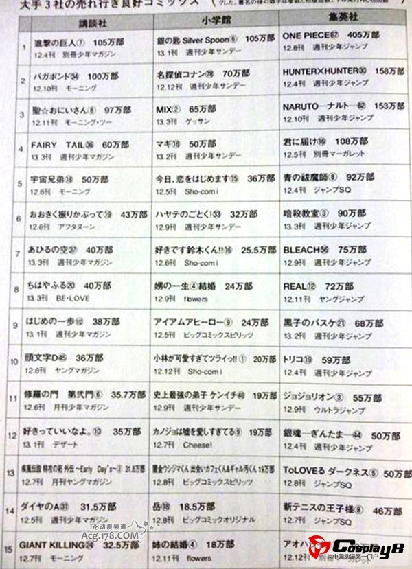 作为日本3大漫画出版社的集英社、小学馆、讲谈社,旗下脍炙人口的作品非常之多,相关的漫画杂志也非常繁杂。那么这3家会社的人气作品是哪些呢?他们的销量又如何?下面就是2012年来的最佳单卷销量统计的TOP15!