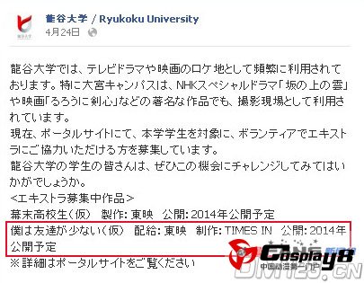 日本龙谷大学最近在Facebook上发表了一条募集临时演员的信息,从中透露了「幕末高校生」(暂名)以及「我的朋友很少」(暂名)两部真人电影将会在 这所学校里进行拍摄的消息。其中最令人关注的是与人气轻小说同名的「我的朋友很少」,消息还指出该真人电影预定于2014年公开,由TIMES IN负责制作、东映担当配给。