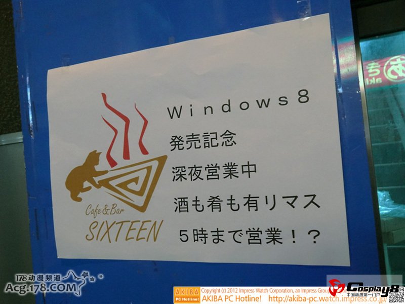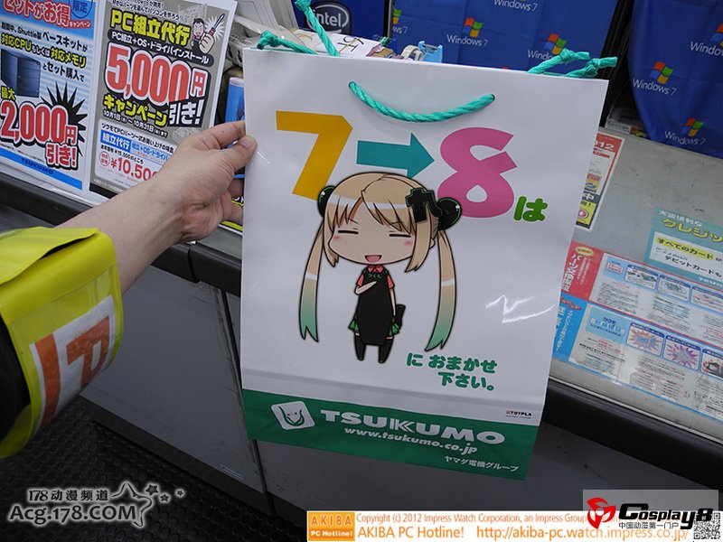 2012年10月26日深夜,日本Windows8系统在秋叶原正式发售,发售现场除了人山人海的购买者之外,还有各种Win8娘周边发售,更 有装扮成Win7娘、Azur云端娘、TSUKUMO娘和win8娘的COSer在现场助兴,小编看了一下现场的组图,就连「夏亚」也在现场!据说今年的 发售现场比起往年水树奈奈主役的Win7发售还要火爆,看来双子萌妹这样的卖点还是非常吸引人的!另外,因为是深夜开卖,所以现场还有夜宵供应哦!下面我 们就来看看现场的火热程度吧!