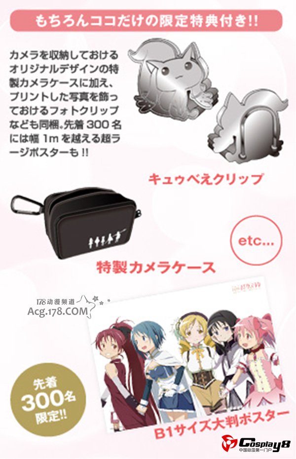 剧场版《魔法少女小圆》前篇“初始之物语”与后篇“永远之物语”与卡西欧的人气数码相机「EXILIM EX-ZR20」进行强强合作,推出“剧场版魔法少女小圆XEXILIM”型限定版相机,于2013年3月下旬发售。25日正式开始预售,仅售500台!