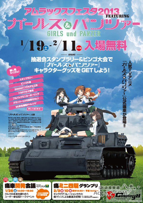 名为「AmluxFesta2013FEATURING少女与战车」的活动正在1月19日-2月11日期间召开,在宣传海报上,官方打出了「少女与战车」公式痛车即将登场的宣传,不少阿宅觉得很有可能是片中登场的四号坦克D型!不过现场发回的痛车写真显示,所谓的公式痛车只是普通的痛车而已。不少死宅表示不是坦克不幸福啊!