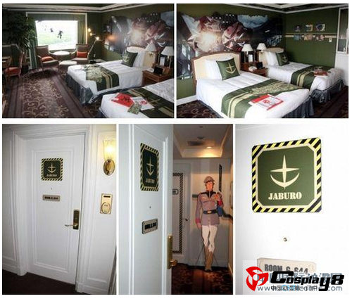 与吉翁公国进行攻防战的“贾布罗房型”设计上以迷彩为主视觉,从房间壁纸、床罩到地毯,还有动画场面展示及模型装饰,甚至连玻璃窗与厕所的卫浴设备也都相当仔细地布置,由于房型仅有一间,因此每天也只能开放一组房客入住(2~3名)。