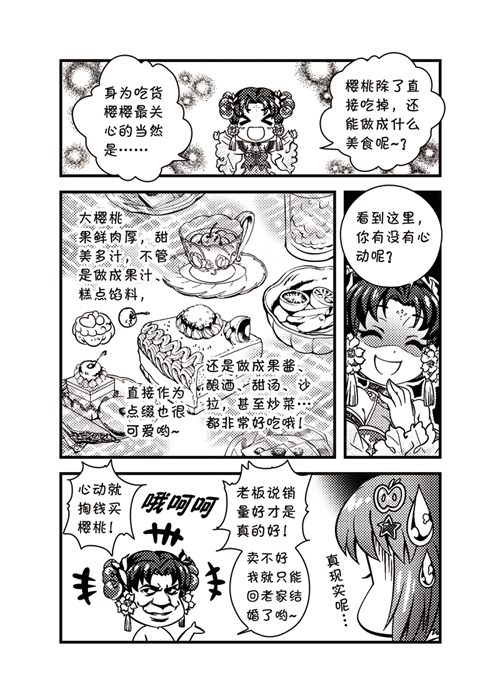 李昀这次创作的大樱桃拟人名叫“樱樱”,性格设定为“担心自己卖不出去的樱桃精灵”的酸甜系元气少女,外形十分有中国传统特色,更手持法器,颇有“天朝魔法少女”的架势。但在漫画中,樱樱自己却吐槽说这个法器并没有什么卵用……随樱桃附赠的漫画,主要对大樱桃进行了萌化科普,意外地十分正经。