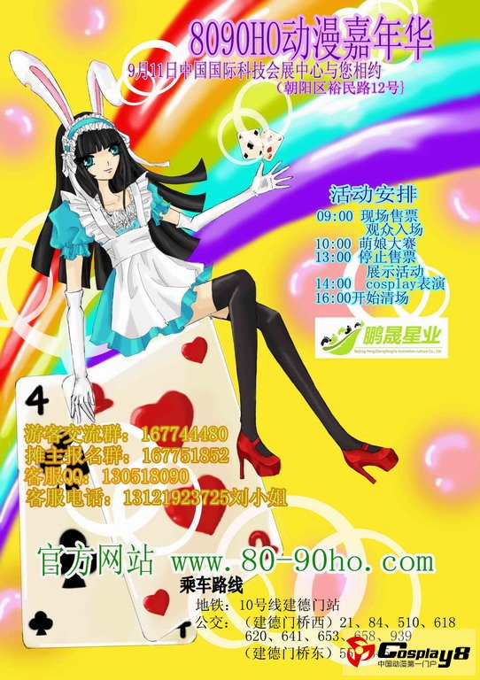 80-90HO同人祭是由北京鹏晟星业动漫文化有限公司独立承办的,力求让广大动漫爱好者找到最喜爱的同人文化的动漫交流会,这次首届80-90HO同人祭将于2011年9月11日,在北京中国国际科技会展中心展开,地铁十号线直达,各种公交便利,届时占地面积5000的会场给力的空调希望能让各位游客玩得愉快。