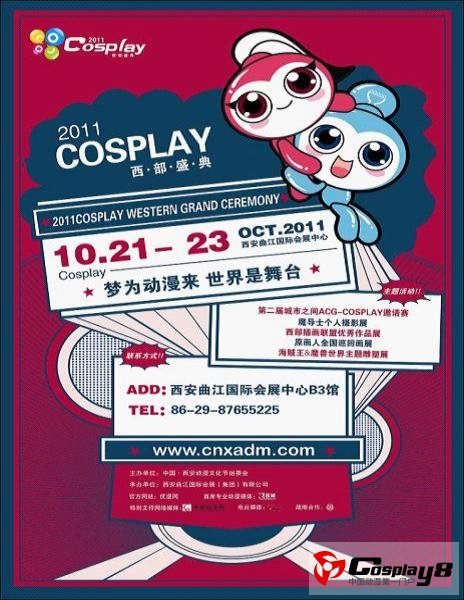 2011COSPLAY西部盛典将于2011年10月21日~23日在西安曲江国际会展中心盛大启幕!本次动漫盛事由中国西安动漫文化节组委会主办,西安曲江国际会展(集团)有限公司承办,现场共设九大展区、五大主题活动,打造你的专属动漫盛宴!