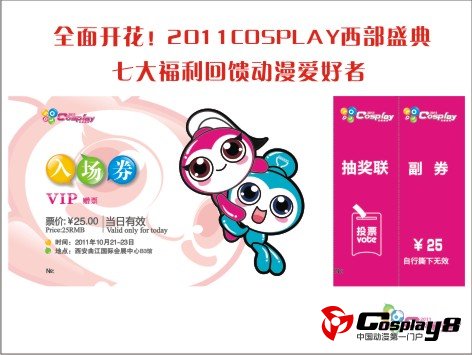 “2011COSPLAY西部盛典”将于2011年10月21日—23日在西安曲江国际会展中心盛大启幕!本次动漫盛事由中国西安动漫文化节组委会主办,西安曲江国际会展(集团)有限公司承办,现场共设九大展区、五大主题活动,打造你的专属动漫盛宴!为了感谢广大动漫爱好者对本次活动的支持,特推出七大福利,回馈广大动漫爱好者!