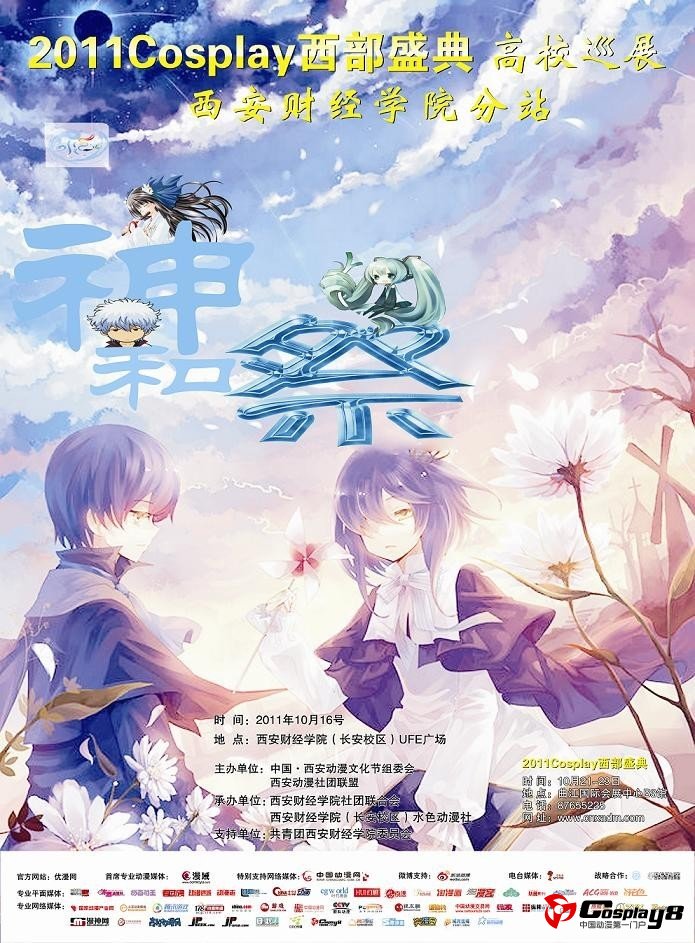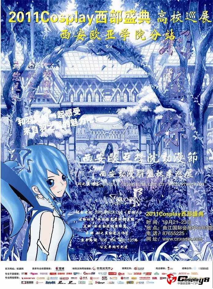 2011COSPLAY西部盛典秋季高校动漫巡展欧亚学院站“羽翼祭”、财经学院站“神和祭”将分别于10月15日、10月16日在西安欧亚学院体育馆、西安财经学院UFE广场举行。