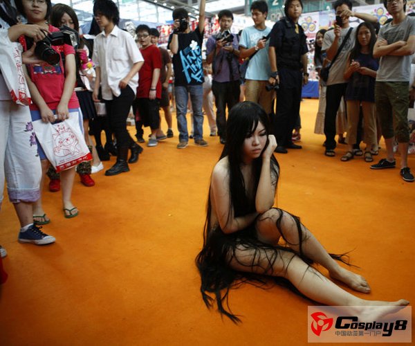 7月18日上午,第四届深圳动漫节在深圳会展中心2号馆隆重开幕,一位打扮成“女鬼”的动漫迷穿着极少衣服向参观者展示自己的造型,其性感的打扮引起在场不少观众围观,随后这名动漫迷被警察带走。图为现场cosplay女子手举牌子,上面写着“求包养”。思琳 摄