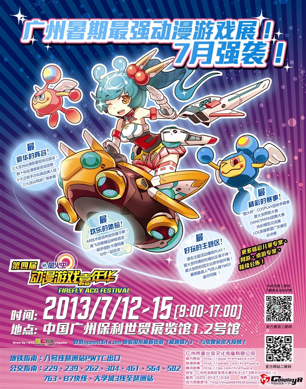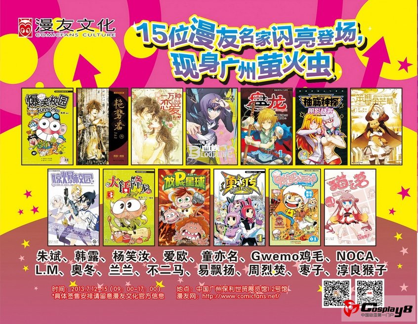 第四届广州萤火虫动漫游戏嘉年华将于7月12日~15日在广州保利世贸博览馆1、2号馆盛大开幕,漫友文化强势进驻,朱斌、韩露、杨笑汝、爱欧、童亦名、Gwemo鸡毛、NOCA、L.M、奥冬、兰兰、不二马、易飘扬、周烈焚、枣子、淳良猴子……15位漫画名家现场签售,与