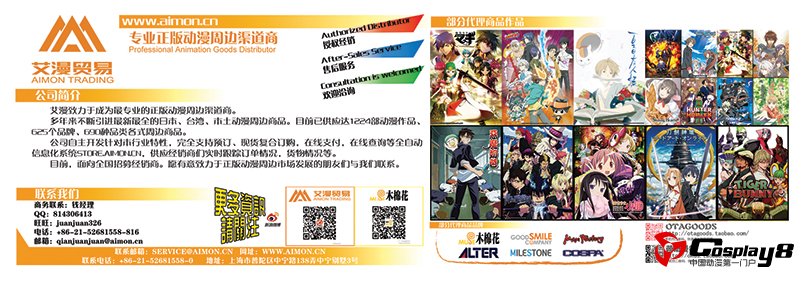 艾漫AIMON公司自2005年成立伊始,先后为国产动漫“悠嘻猴”、“刀刀”、“小破孩”等诸多知名卡通品牌进行品牌形象推广、周边销售。并于2007年作为日本知名周边品牌“COSPA” 中国独家总代理进行国内品牌运营及产品销售。2010年成为台湾知名周边品牌“木棉花”中国总代理。同年成为ALTER中国代理商。目前艾漫正在引进更多的海外品牌进入中国,同时将本土动漫带到国外。