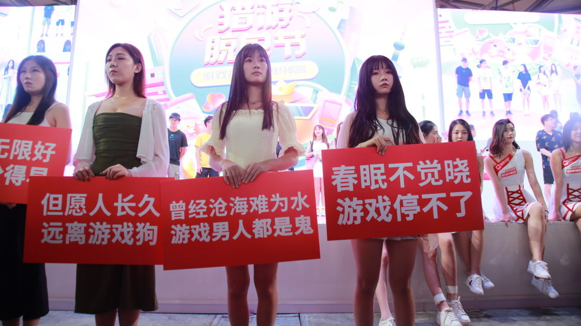 除了性感美女抢镜抢眼之外,记者在现场看到,5名美女手中的KT板上都印有不同的标语,既有“曾经沧海难为水,游戏男人都是鬼”、“但愿人长久,远离游戏狗”,也有“贫贱夫妻仍有爱,游戏情侣百事哀”、“春眠不觉晓,游戏停不了”等搞笑俚语,无不表现出这些“受害”女生们的心声。