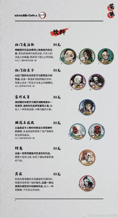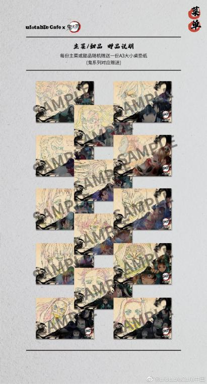 ufotableCafe上海店第一期呈现的各类食品,是以TV动漫「鬼灭之刃」第一话至第七话的故事为灵感,精心制作的与鬼灭有关,或剧中出现过的各类美食。购买菜品、饮品均可获得赠品!