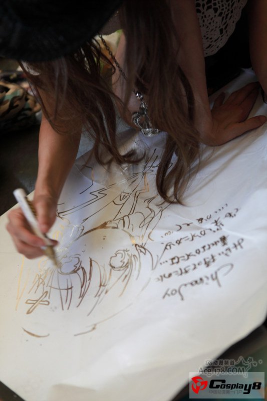 在7月31日的2011 ChinaJoy现场,突然发现了一个熟悉的身影,日本COS界的大牌Kipi居然出现在2011 ChinaJoy现场,记者们立刻跑过去邀请Kipi拍照,并且签名合影,签名时Kipi还在海报背面画了自己的漫画像,真是能写会画的才女啊!
