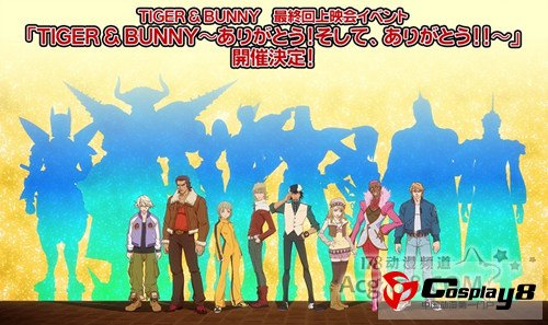 人气动画《TIGER & BUNNY》就将要在9月17日迎来完结了,为了纪念完结,制作方SUNRIES特别决定将在东京的新宿WILD9电影院举行『最终回上映会』。在这次上映会上,观众可以在电影院内同步观看到《TIGER & BUNNY》的24集和25集,在正式放映前,两名主角的声优平田广明和游佐浩二还将到场与观众们见面!