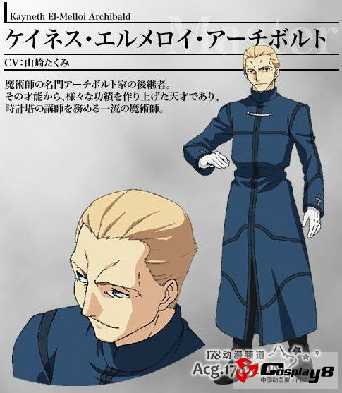 肯尼斯·阿其波卢德·艾尔梅洛伊(CV:山崎功) 同时其有风与水二种属性,还精通降灵术、召唤术与錬金术。在时钟塔担任降灵科的一级讲师,为了增加知名度而参加圣杯之战,虽然是维瓦·贝尔贝特的导师,却十分讨厌他。与降灵科部长的女儿订有婚约。属于他的魔术礼装为“月灵髓液”,利用魔术化的水银进行防御、攻击、搜索三项合一的礼装。搜索是放出水银,利用触觉感应周遭的变化搜集情报;攻击是利用水银凝聚成鞭状打击目标,具有比拟刀刃的攻击;防御是把水银变化成薄膜抵挡攻击,由于利用流体力学的原理因此无法防御剧烈变化的攻击。