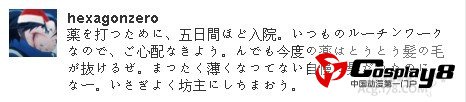 要住院五天打点滴。这是常有的事情,所以不用担心。这次药的副作用让头发脱落了,变得很稀薄,我可是以头发为豪呢,果断剃光变成和尚好了