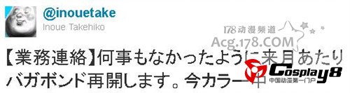 知名漫画家井上雄彦今天中午在推特上宣布“「浪客行」将在下月重新开始连载,现在正在上色”。「浪客行」是以吉川英治的小说「宫本武藏」为原型的青年漫画,在1995年开始连载后,到现在已经推出了33卷单行本,共售出6000万册。之前,从2010年12月开始,已经停止连载了超过一年时间。
