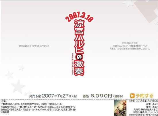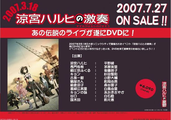 凭借现在凉宫的人气如果不出《凉宫春日的激奏》的DVD那凉宫的商品策划人员就是脑子有问题了(看看凉宫的COSAV都出了好几弹了)。如今出凉宫的商品就好像最近我国股市一样买什么升什么(这里利用了夸张的修辞,股市有风险,投资请谨慎)。在《凉宫春日的激奏》在售票期间网上的票价炒到了66000日元。演出结束后还除了特别的海报和黑胶唱片(买到了脱销),现在官方终于宣布的DVD化。这对于许多无法亲临现场的朋友来说是件造福人民的事。