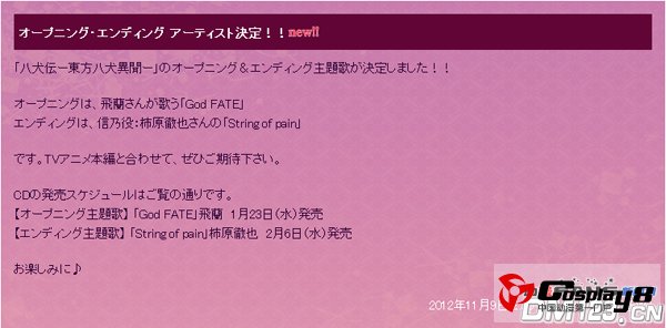 有关本作TV动画的主制作班底、声优阵容、角色设定图等情报都已在之前披露,而此次新情报终于浮出水面——本作TV动画将作为冬季新番在来年1月正式播 出,此外OP、ED主题歌详细情报也一并公开。OP「God FATE」将由飞兰献唱,曾为「CANAAN」、「未来日记」等作演唱过歌曲的她,其浑厚的声线给人留下了深刻的印象,此次她会如何演绎本作的OP,还是 很让人期待的。ED「String of pain」则由出演本作TV动画信乃一角的柿原彻也献声,而他又会为大家带来怎样的听觉盛宴同样值得期待呢。另外,OP、ED单曲的发售日分别预定在了来 年1月23日、2月6日。