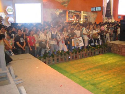 《R2》城堡大门落下的瞬间,四名身着《R2》各职业装束的Cosplay演员同时登场,为大家首先奉献了一场精彩的Cosplay表演。与此同时,城堡两侧的投石车也已装填好“炮弹”,随着一声令下,联众最抢手的周边大Doby投向了在场玩家。周边虽好,数量有限,现场因哄抢人数过多导致活动一度失去控制,不少玩家更差点因为大Doby而失足倒地,幸好由于台湾名模冯媛甄的及时出场才得以平息。
