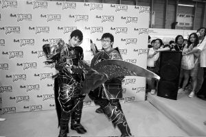 两位好男儿身着厚重的盔甲,变身游戏人物。张晓晨化身游戏中的 龙骑士 ,王传君则成了 狂战士 ,与另两位 魔法师 和 圣射手 的扮演者在现场比拼Cospalay演技。随后,百代唱片公司新歌手黄龄也来到了现场并一口气演唱了三首歌.