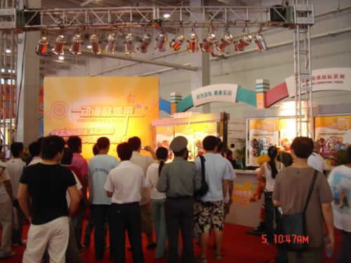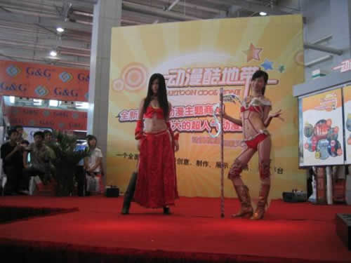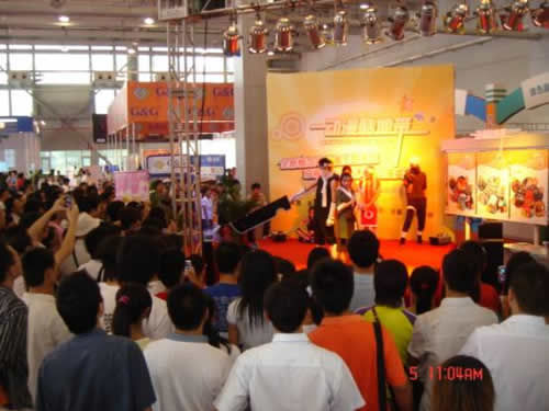 (动漫酷地带的展示区) (COSPLAY表演的火爆现场,参观者争相拍照留念) (游戏人气女孩playgril也亮相在动漫酷地带的舞台)